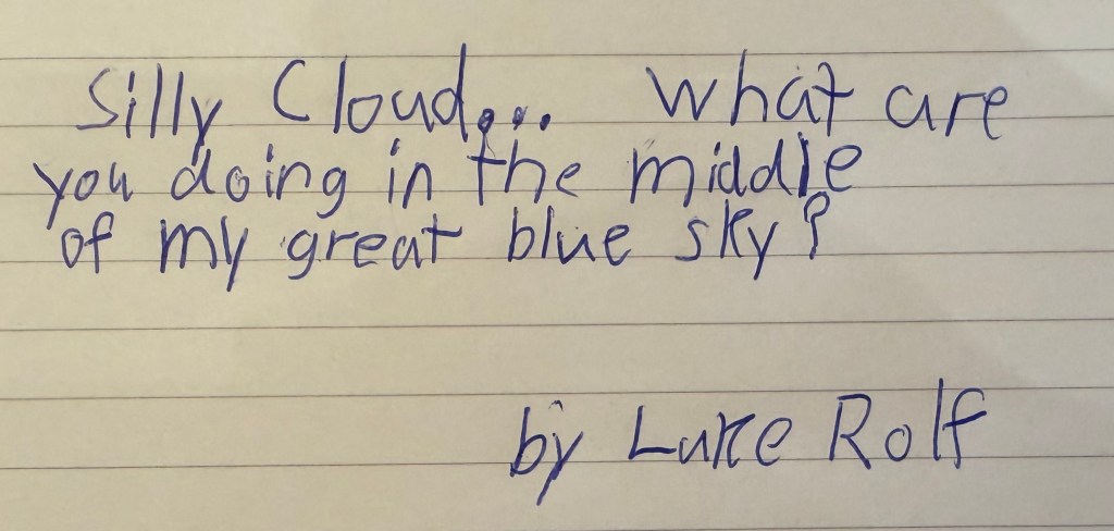 We talked about traditional haiku, how they tend to focus on nature, and he started coming up with ideas right away. We brainstormed about tigers, and then (one of my favorite topics to write about) clouds. I encouraged him to think of a feeling a cloud may have given him–silly or serious! In the end, he came up with this sweet poem: