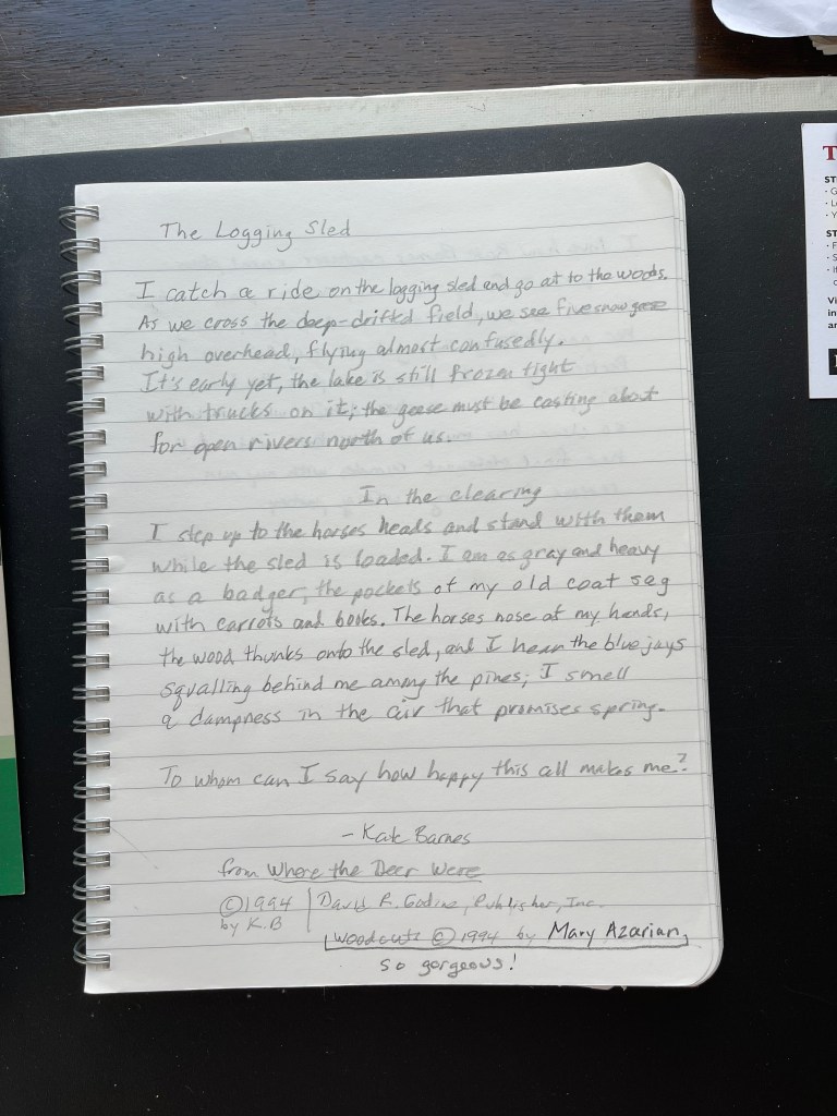 One Maine poet I enjoy is Kate Barnes. Here is one of her poems that captures some textures of her rural life. Her last line expresses why some of us write poetry.